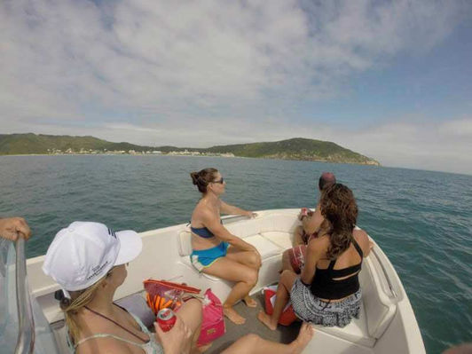 Lancha Black White – Phantom 30 pés (2018). Motor V8 320 Mercruizer. Quarto, banheiro com descarga elétrica, solário de proa, banco de popa rebatível, som bluetooth e pendrive, churrasqueira a carvão, cooler, água doce. Duração: 4/8 horas. Capacidade: 9 pessoas. Embarque: Canal da Barra da Lagoa. Pernoite: Não .